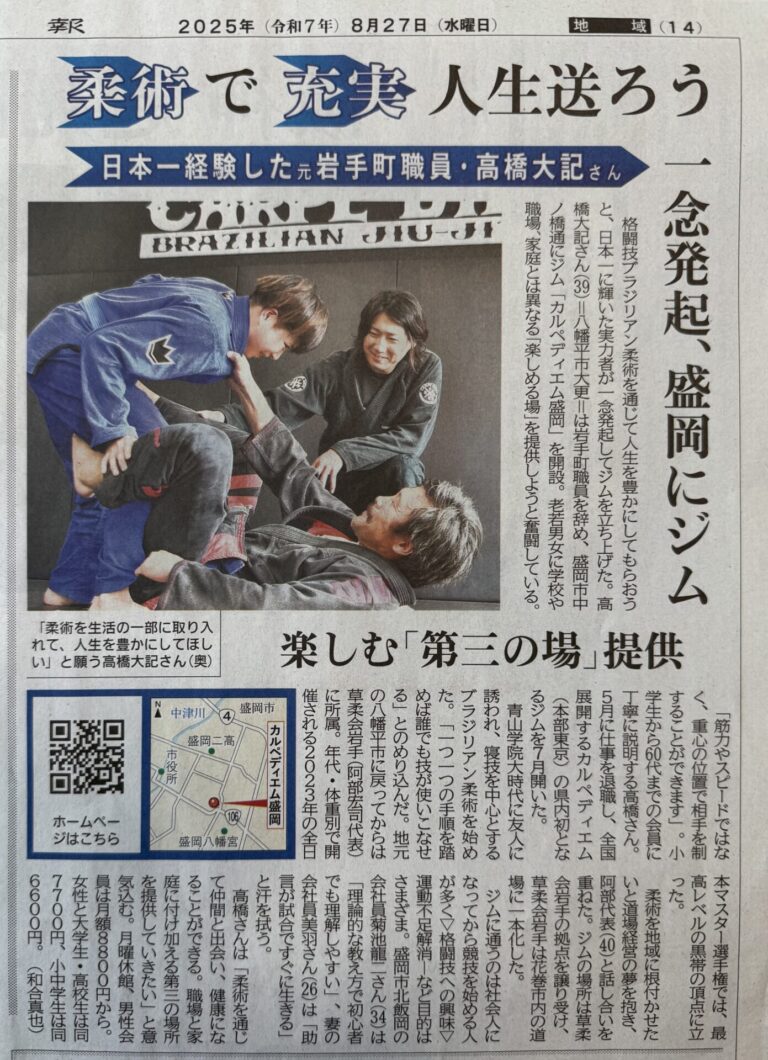 岩手日報さまの「ひと」にカルペディエム盛岡メインインストラクターの高橋を取り上げていただきました。 「ひと」 寝技中心の格闘技の年代、体重別の全日本マスター選手権で最高位・黒帯の頂点に立った経験を持つ。7月