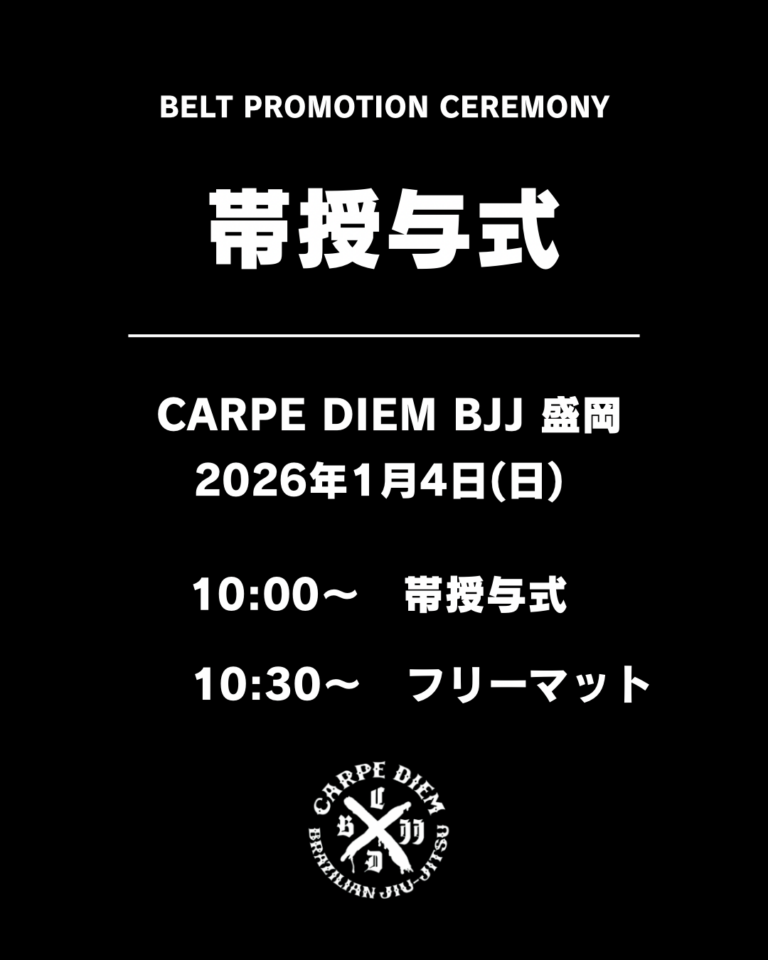 2026年1月4日(日)に、カルペディエム盛岡にて、帯授与式を行います。 昇帯される方は、ご出席をお願いいたします。(新しい帯については、カルペディエム盛岡にてオフィシャルベルトをご用意いたします。) 一緒にお祝いしてく