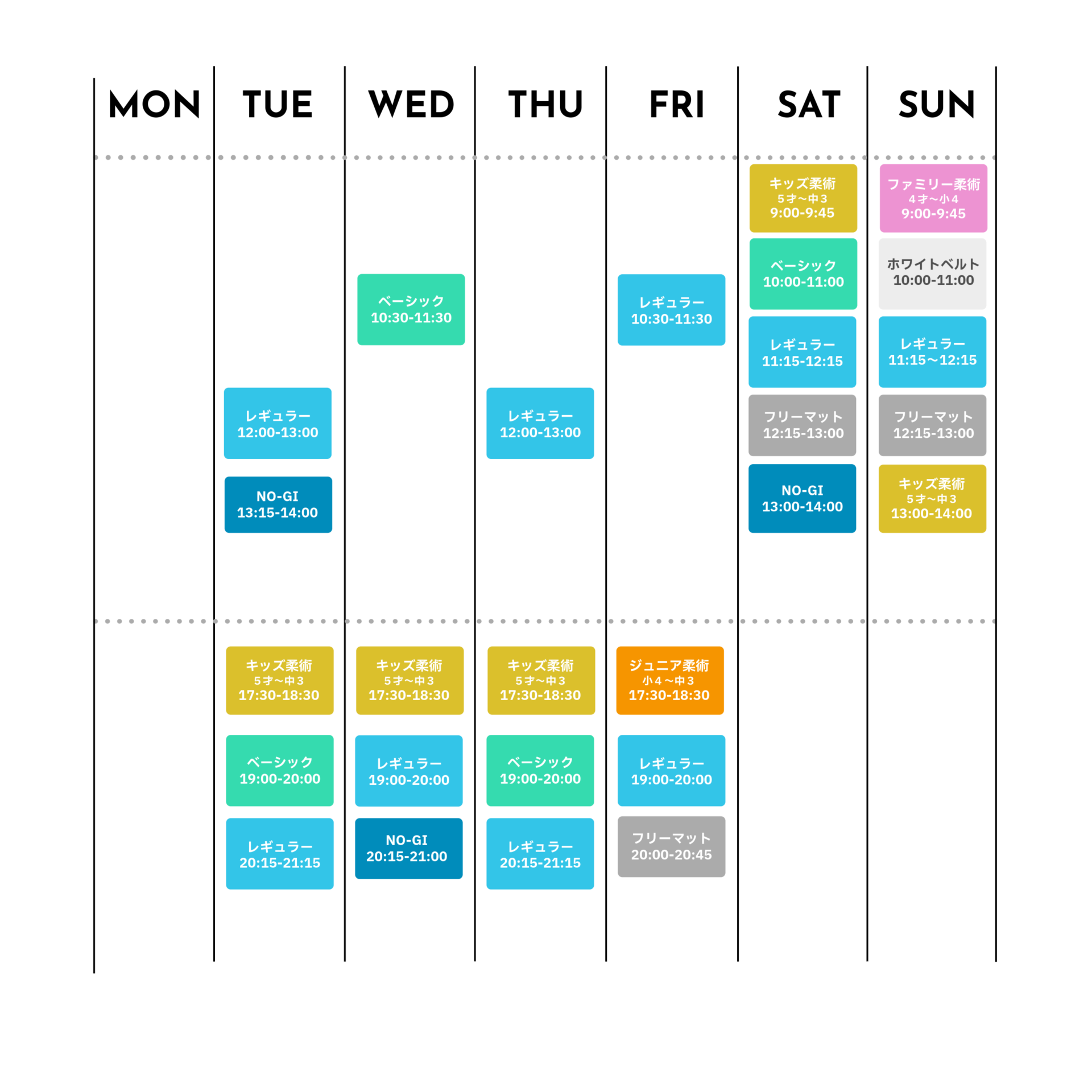レギュラークラスは、柔術に必要なすべての要素を学んでいくクラスです。このクラスでは、基本技から最先端の技まで幅広く身につけることができます。